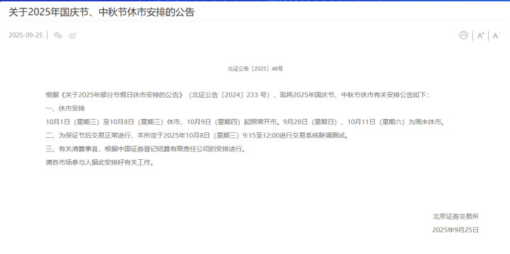 中新经纬9月25日电25日晚间,三大交易所发布2025年国庆节、中秋节休市安排称,10月1日(星期三)至10月8日(星期三)休市,10月9日(星期四)起照常开市。另外,9月28日(星期日)、10月11日(星期六)为周末休市。