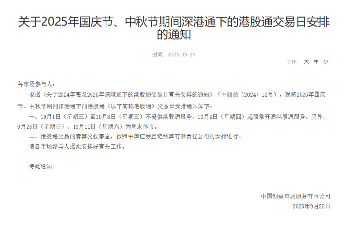同时,上交所、深交所发布《关于2025年国庆节、中秋节期间沪/深港通下港股通交易日安排的通知》称,10月1日(星期三)至10月8日(星期三)不提供港股通服务,10月9日(星期四)起照常开通港股通服务。另外,9月28日(星期日)、10月11日(星期六)为周末休市。